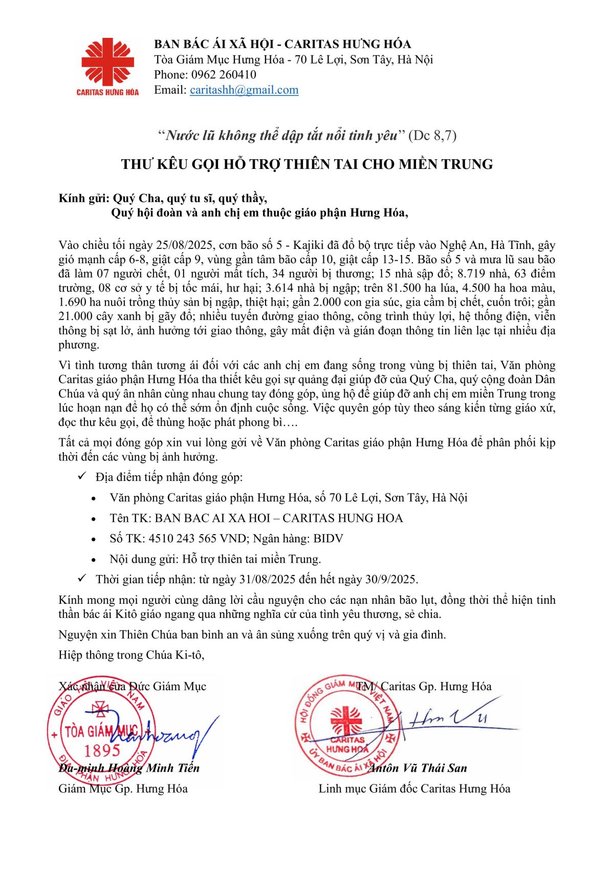 Vì tình tương thân tương ái đối với các anh chị em đang sống trong vùng bị thiên tai, Văn phòng Caritas giáo phận Hưng Hóa tha thiết kêu gọi sự quảng đại giúp đỡ của cộng đoàn Dân Chúa và quý ân nhân cùng nhau chung tay đóng góp và giúp đỡ anh chị em miền Trung trong lúc hoạn nạn để họ sớm ổn định cuộc sống.