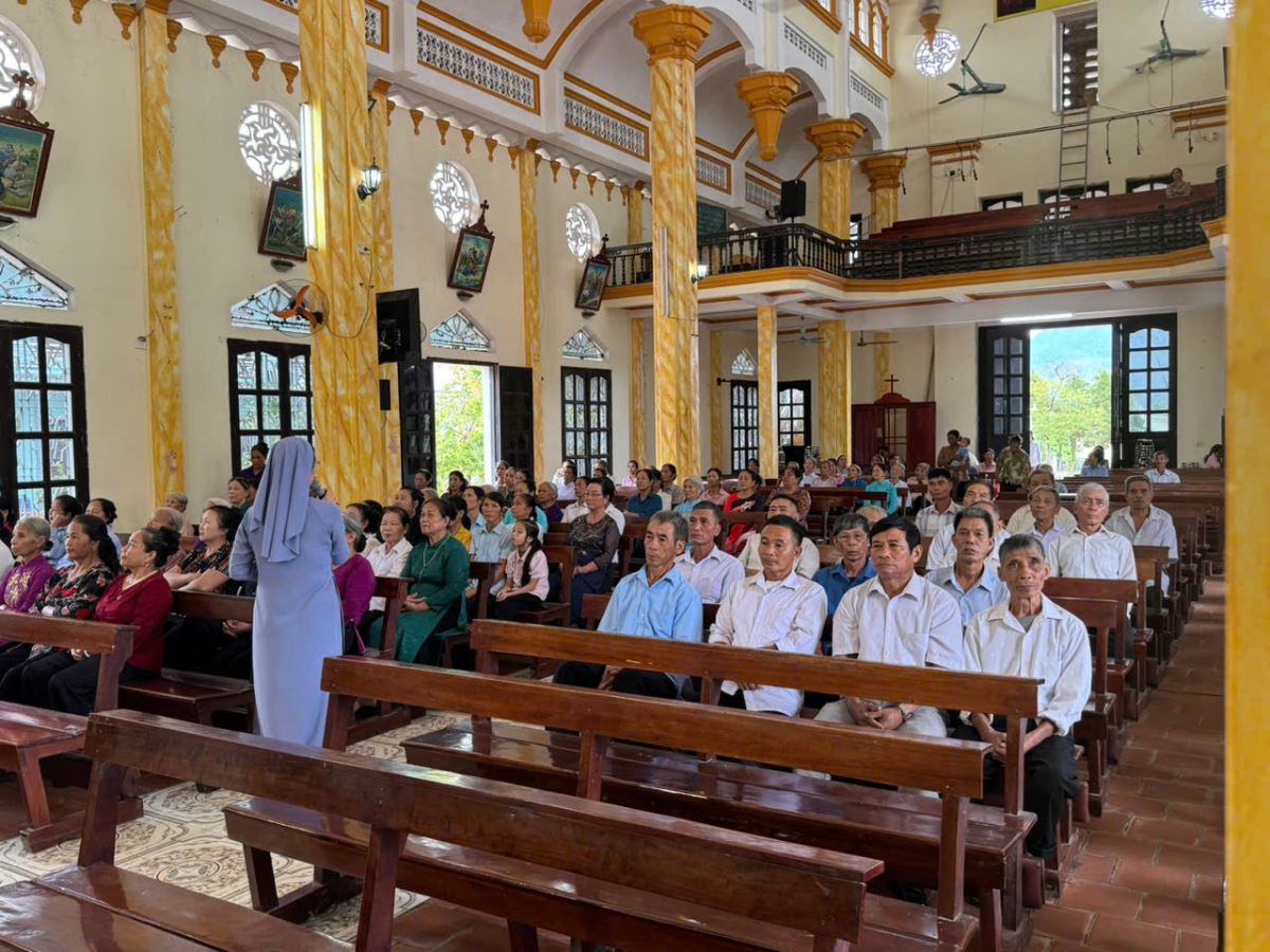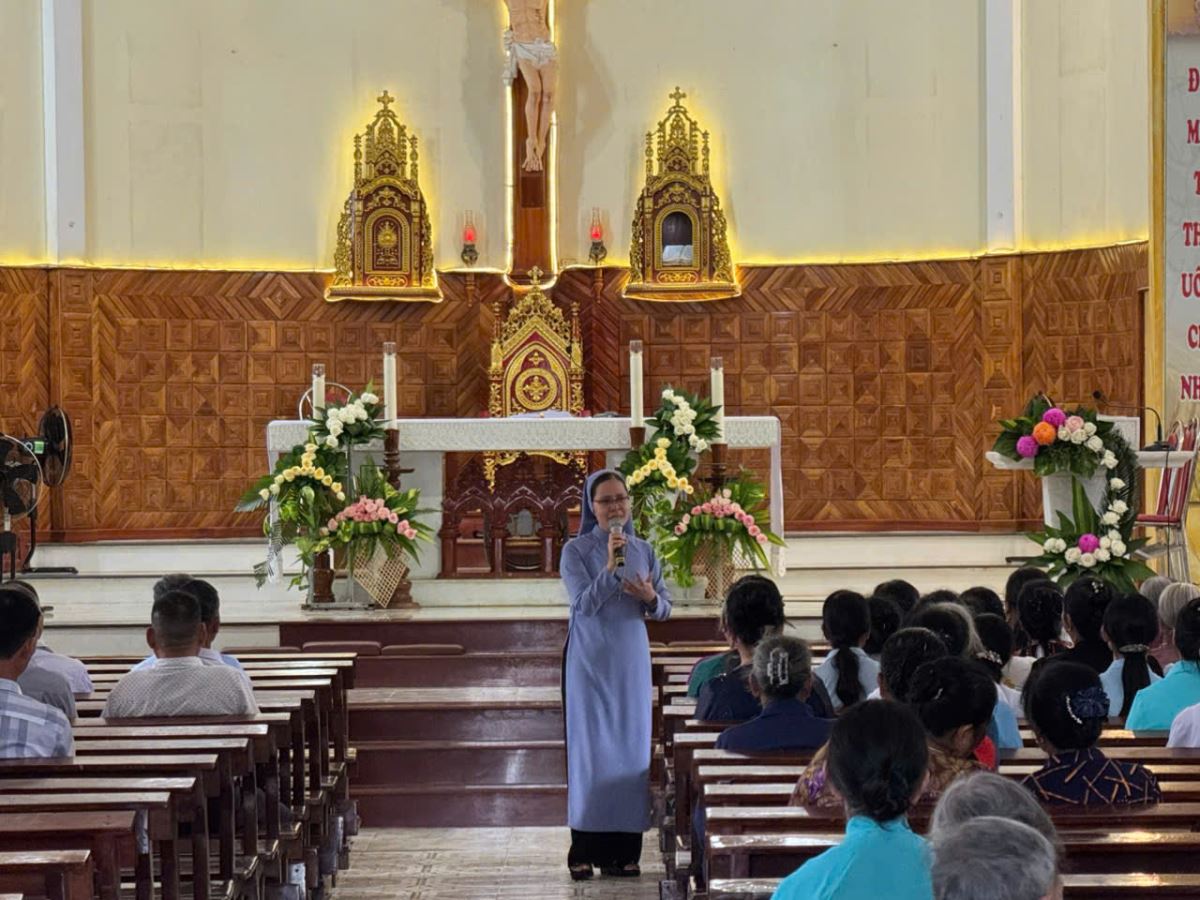 Sau khi tĩnh tâm và xưng tội, các hội viên và tân hội viên Caritas giáo xứ Ro Lục được lắng nghe chia sẻ về linh đạo và điều lệ của UBBAXH – caritas Việt Nam. Trong buổi chia sẻ, Sr. Catarina Nguyễn Thị Niên – đại diện CHH trình bày về linh đạo Caritas.