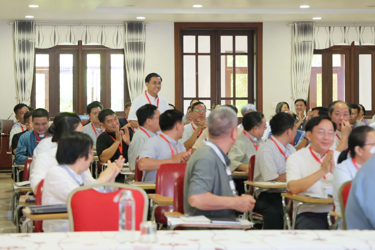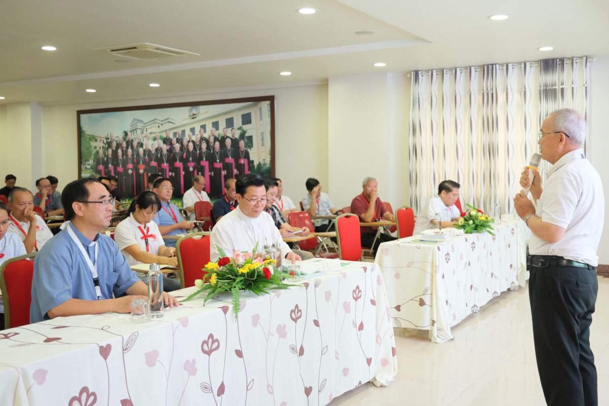 Buổi chiều, Hội nghị tiếp tục phần tập huấn với đề tài “Laudate Deum – Hãy Ngợi Khen Thiên Chúa” và Chiến lược Ứng phó và Giảm nhẹ Rủi ro Thiên tai” do cha Anselmo Nguyễn Hải Minh, OFM trình bày. Trong Laudate Deum của Đức Thánh cha Phanxicô, cha Anselmo nhấn mạnh đến thao thức, lo lắng của Đức Thánh Cha trước biến đổi khí hậu. Ngài tha thiết kêu gọi cộng đồng nhân loại hãy đồng trách nhiệm trước tình trạng biến đổi khí hậu, gây thảm hoạ cho nhân loại trong đó người nghèo phải chịu thiệt thòi nhất. Trong đề tài về Chiến lược Ứng phó và Giảm nhẹ Rủi ro Thiên tai, cha Anselmo trình bày về những phương cách mà đất nước Philippines và Nhật Bản từng ứng phó với thiên tai. Sau đó, các Đại biểu có thời gian thảo luận, để có thể đưa ra những khởi xướng, kế hoạch góp phần thay đổi nhận thức, hành vi từ cá nhân đến cộng đồng trong việc bảo vệ môi trường cũng như có những cách thức ứng phó trước thiên tai.